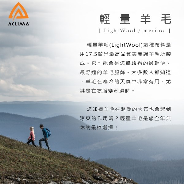 此款服飾由100%美麗諾羊毛製成,在任何活動中穿著都透氣並能調節體溫。輕量羊毛系列非常適合長途旅行,並且羊毛本身具有天然抗臭特性。只要簡單地晾乾並放置於通風處,就能準備再次使用。和其他品牌相比,Aclima輕量羊毛系列很可能會是您穿過最柔軟舒適的羊毛服飾。由17.5微米(micron)織線製成、材質重量僅每平方140公克(140g/m2)。