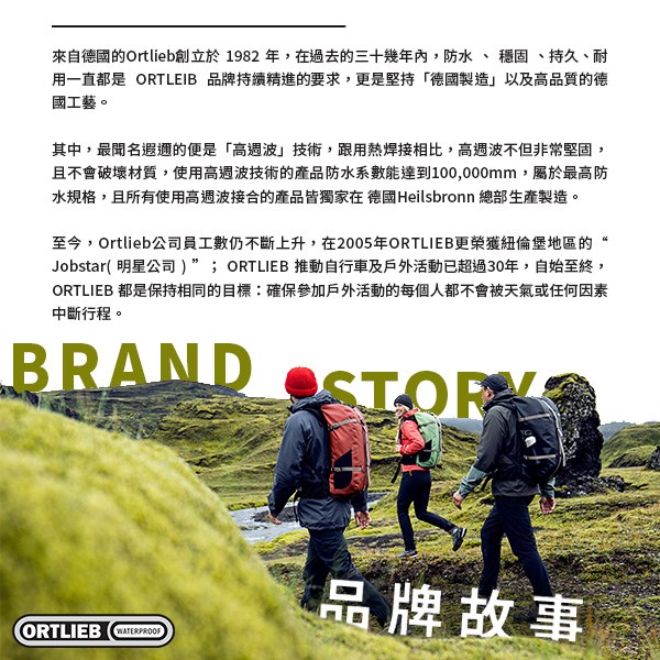 1982年ORTLIEB於德國創業時,僅有一個後院辦公室般大小,數坪大的狹隘空間,經過多年來的奮鬥與努力經營,今天已擁有摩登大樓規模的廠區。目前ORTLIEB不只是在擴大與延伸自己的經營面,同時更為促進全球社會的戶外運動發展,帶來豐碩的成長。